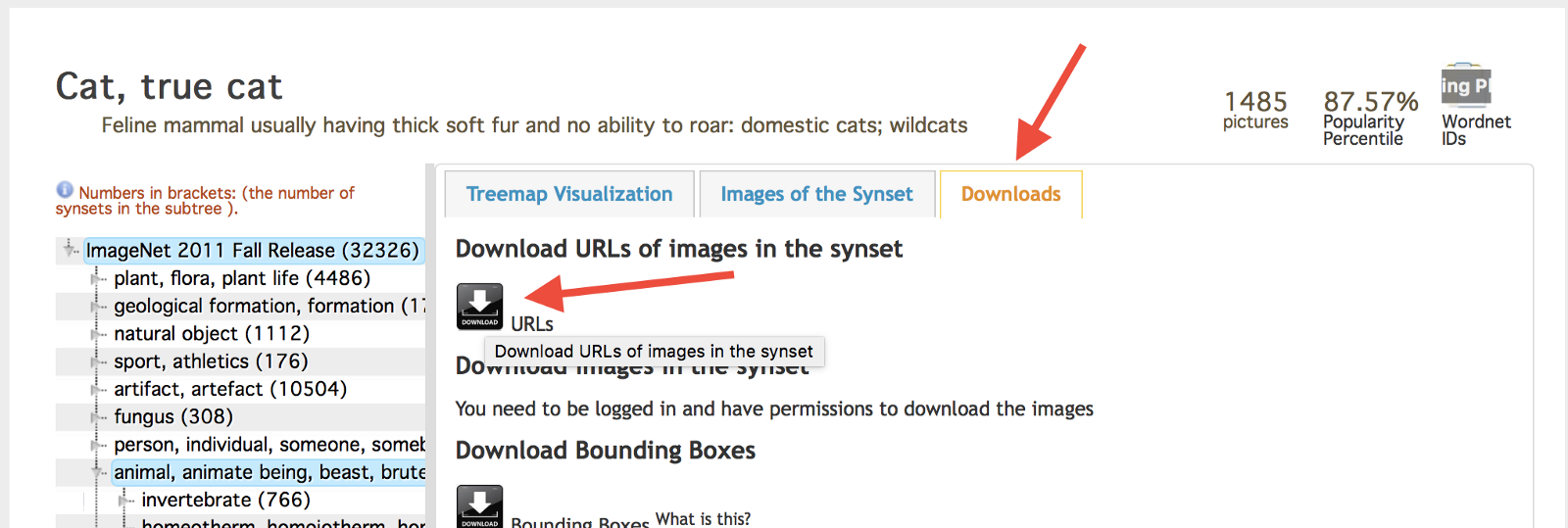The first step is to download a lot of images of cats and dogs. This is necessary because we will be using the images to train our custom model. Instead of downloading images from Google Images which might take eternity, we can utilize the services like ImageNet. Go to ImageNet and search for cat. This will bring up a lot of different results. We selected “true cat” which will take you to a new page where you can download the URLs for all the cat images.