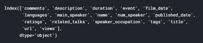 #Getting the datadf = pd.read_csv("../input/ted_main.csv")df.columns