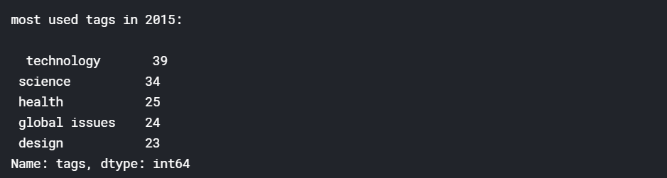 df2015 = df[df["published_year"]=="2015"]tags2015 = []for i in range(len(df2015.loc[:,'tags'])):ls = list(df2015.loc[:,'tags'])[i][2:-2].split(',')for c in range(len(ls)):value= list(df2015.loc[:,'tags'])[i][2:-2].split(',')[c]tags2015.append(value.replace("'",""))tags2015 =pd.DataFrame(tags2015,columns=["tags"])