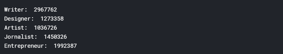 print("Writer: ",int(df[df["speaker_occupation"]"Writer"]["views"].sum() / len(df[df["speaker_occupation"]"Writer"])))print("Designer: ", int(df[df["speaker_occupation"]"Designer"]["views"].sum() / len(df[df["speaker_occupation"]"Designer"])))print("Artist: ",int(df[df["speaker_occupation"]"Artist"]["views"].sum() / len(df[df["speaker_occupation"]"Artist"])))print("Jornalist: ",int(df[df["speaker_occupation"]"Journalist"]["views"].sum() / len(df[df["speaker_occupation"]"Journalist"])))print("Entrepreneur",int(df[df["speaker_occupation"]"Entrepreneur"]["views"].sum() / len(df[df["speaker_occupation"]"Entrepreneur"])))