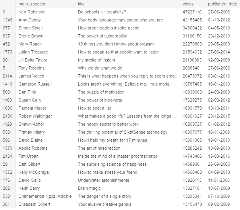 df = df.sort_values('views', ascending=False)df[["main_speaker","title","views","published_date"]].head(25)