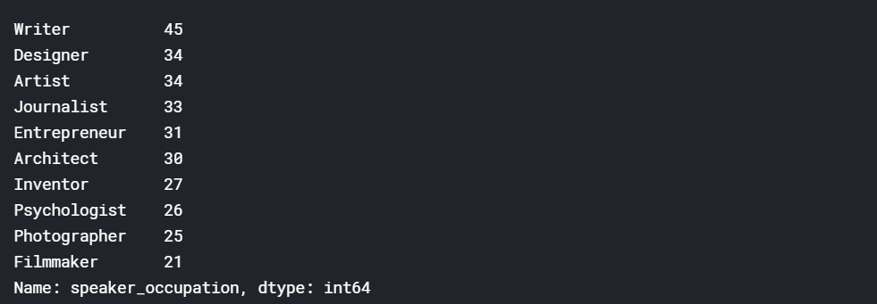 As the output suggests, writers ahead by a big gap. TED attaches importance to intellectual knowledge of speakers. If you have an achievement on the artistic field, there is no obstacle.
