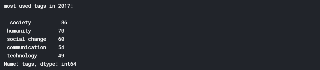 df2017 = df[df["published_year"]=="2017"]tags2017 = []for i in range(len(df2017.loc[:,'tags'])):ls = list(df2017.loc[:,'tags'])[i][2:-2].split(',')for c in range(len(ls)):value= list(df2017.loc[:,'tags'])[i][2:-2].split(',')[c]tags2017.append(value.replace("'",""))tags2017 =pd.DataFrame(tags2017,columns=["tags"])