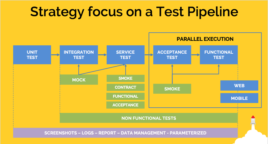From Integration to Functional Testing (end of the pipeline) we have to worry about non-functional tests. Examples of tests are functional: performance, load, security, etc …