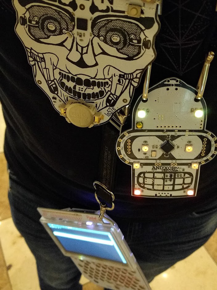 L-R: DEFCON 24 (2016) electronic badge, Bender Badge by AND!XOR (v1) — both utilizing UART