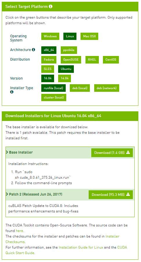 To install CUDA you’re going to need to download the right installer. If you followed the first tutorial then you probably installed Ubuntu 16. That means you need CUDA 8. You can find that here.