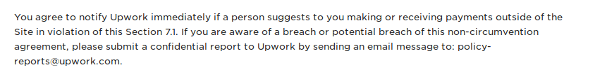 Now, Upwork wants my clients to rat on me if I’m even to think out loud about leaving. As I said, I wasn’t the only one thinking about the great escape. I shared my findings and concerns with some of my freelance buddies. What do you know, it turns out that Upwork isn’t just being hard on its freelancers and clients, but the competitors, as well.