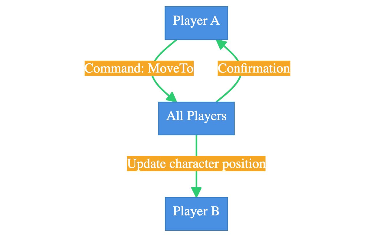 Continuing the example with player A, they send the command MoveTo(1, 2) to all players. After receiving confirmation from all players, Player A moves to the new position, and the character of Player A also moves to the new position on their screens.