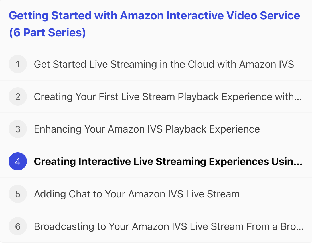 So far in this blog series, we've created our first live streaming channel, learned how to create a playback experience in the browser, and enhanced that experience with the Amazon Interactive Video Service (Amazon IVS) player SDK. In the next few posts, we're going to look at adding some interactivity to our playback experience.