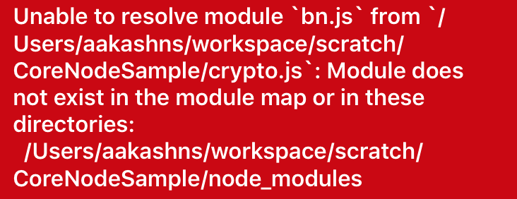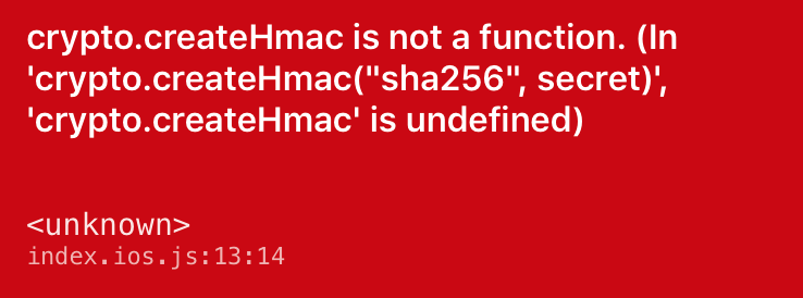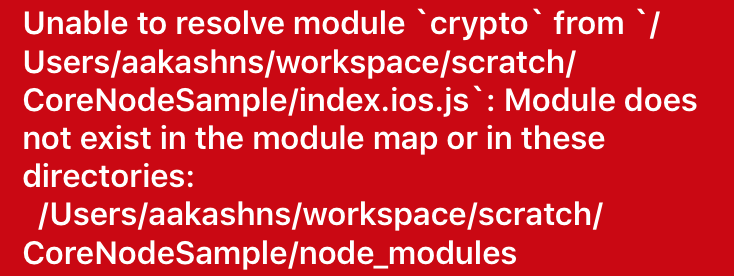 But this doesn’t work, because crypto is a core Node JS module, which means it’s probably C++ code bundled with the Node JS binary, not Javascript. The React Native packager can’t package it[1] along with your app’s Javascript bundle, so you get a runtime error: Unable to resolve module 'crypto'.