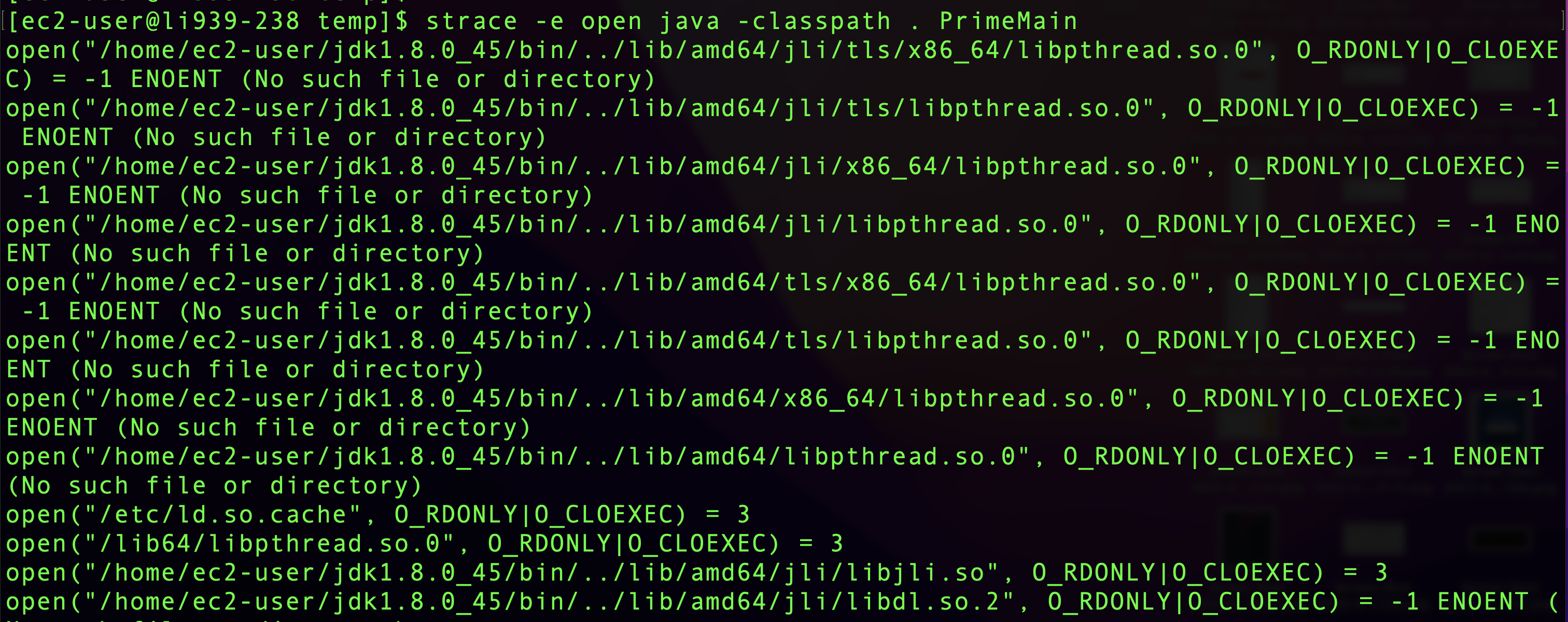 open("/home/ec2-user/jdk1.8.0_45/bin/../lib/amd64/jli/x86_64/libpthread.so.0", O_RDONLY|O_CLOEXEC) = -1 ENOENT (No such file or directory)