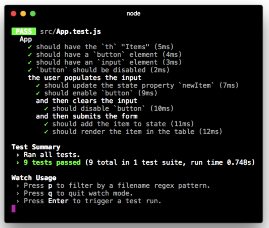 Jest is a testing framework created by Facebook. Facebook uses it to test JavaScript and React code. It was created under the premise of performance, features and adaptability. Jest provides an integrated “zero-configuration” experience. This is a differentiator from other popular testing frameworks like Mocha. Some of the killer features are: