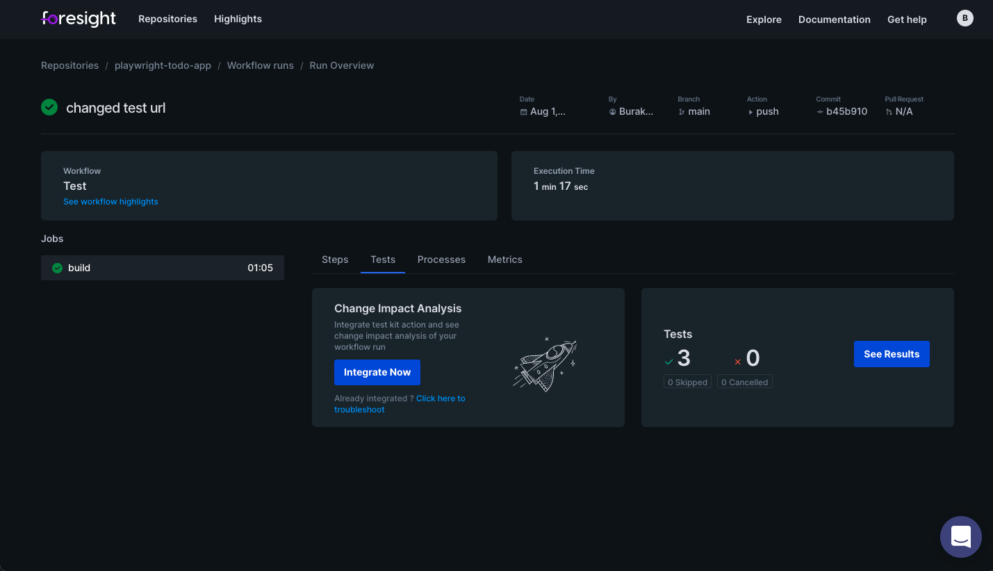 It looks very similar to GitHub Actions; however, it is powered up with unique features such as Change Impact Analysis and Highlights. Unlike GitHub’s messy log view, you can easily access your test results with a clean design. You can learn more about Foresight here.