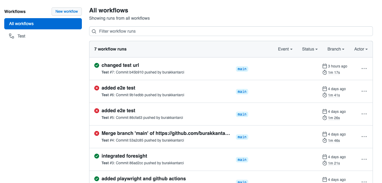 This action will automatically send your test report to Foresight, and Foresight will analyze your tests in the most user-friendly way. After updating your YAML, your workflow will run automatically, and you will be able to see your workflow run results as below in Foresight: