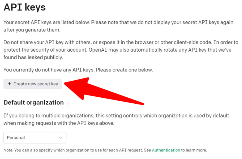 - On that page, you’ll see an option that says “create new secret key” under the API keys section.