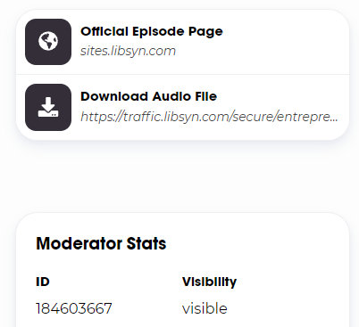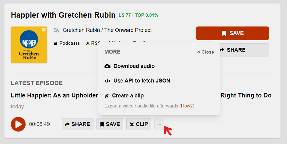 If you scroll down, you’ll see info about the podcast, options to share on socials, and a small section with the option to download the audio file.