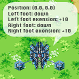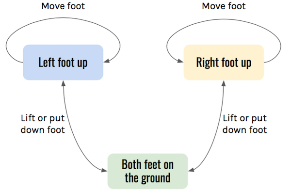 Fortunately, Henry is capable of performing actions. Even though he cannot perceive much of the world, he know what he is capable of doing, and that depends on his state. For example, when both his feet are on the ground, he can lift one. And when one foot is in the air, he can move it forward or backward.