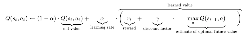 First, instead of replacing the old value by the new value, the old value fades away at a certain rate (alpha, the learning rate). This enables the robot to take into account noise. Some actions might work sometimes, and sometimes not. With this progressive evolution of the Q-Value, one faulty reward doesn’t mess up the whole system.