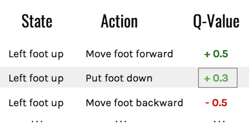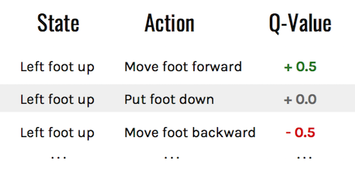 Q-Values updated with Bellman equation. Note how putting a foot down now is seen as positive instead of neutral, as is benefits from the reward of taking the next step.