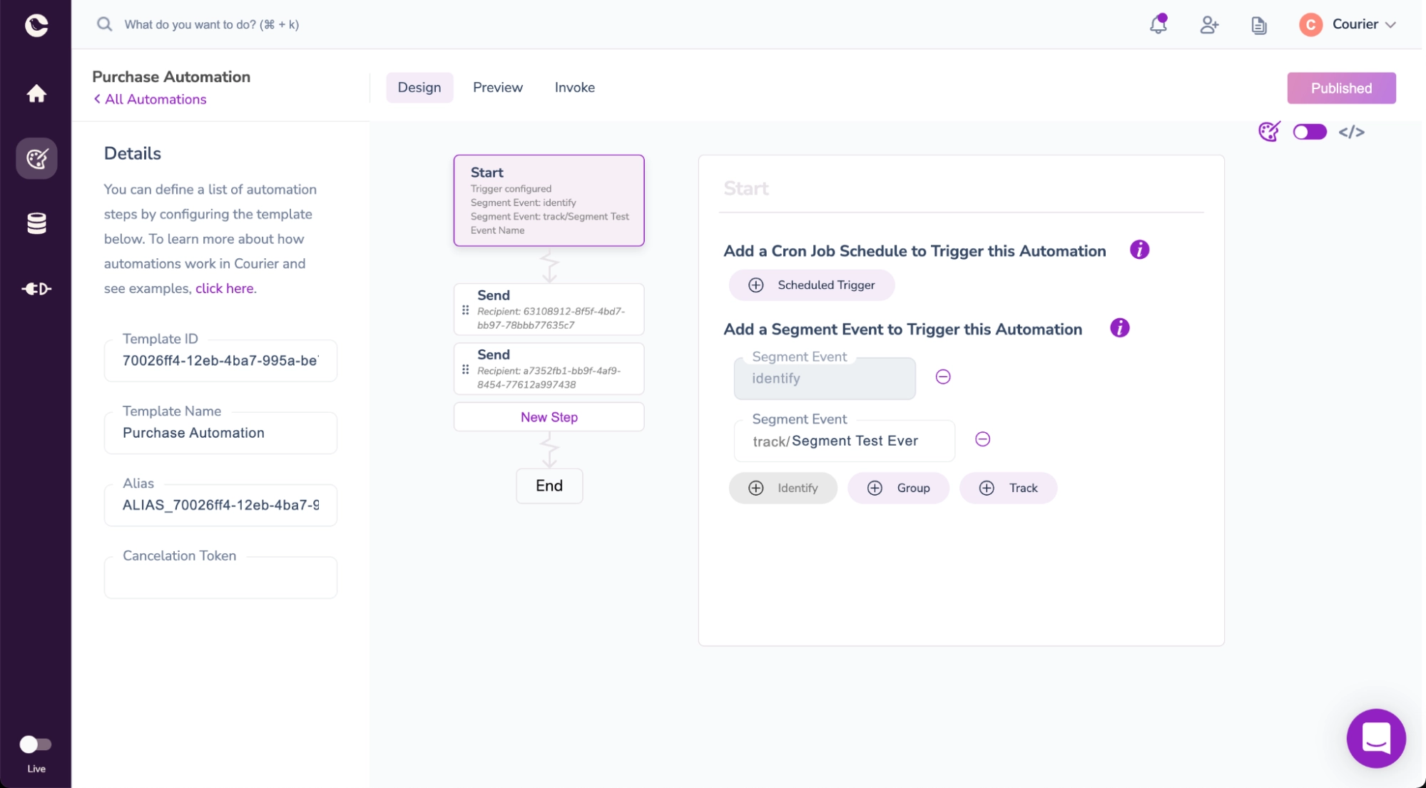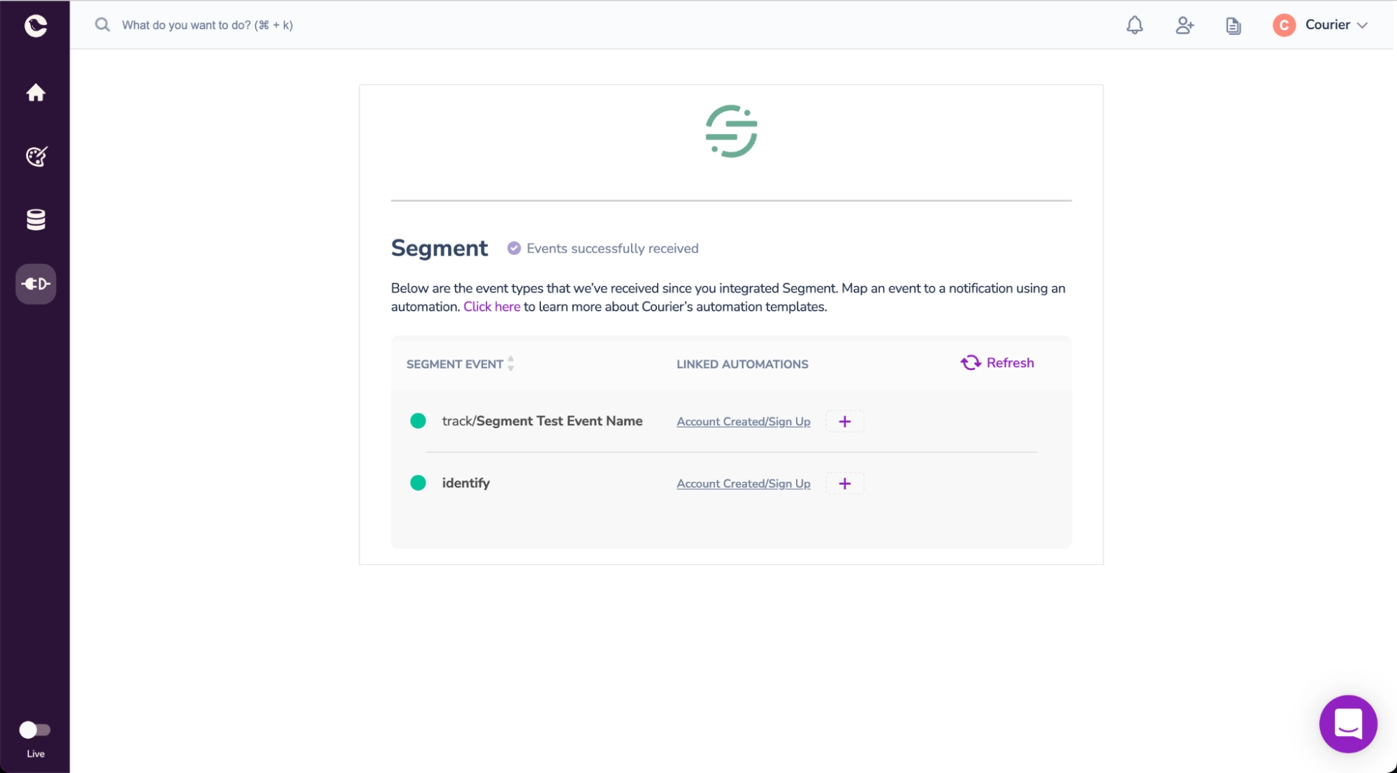 Segment integration in Courier: Segment events, once triggered on your application, can be located in Courier and linked to automations. In this example, our events are linked to the “Account Created/Sign Up” automation that sends a Welcome email to the user when triggered.