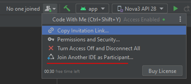 After that, you will be given access to edit the project and you can work on it together anywhere in the world. But you can also work on the current computer. This is what we will try to do. Click again on the icon and select Join Another IDE as a Participant and paste the copied link: