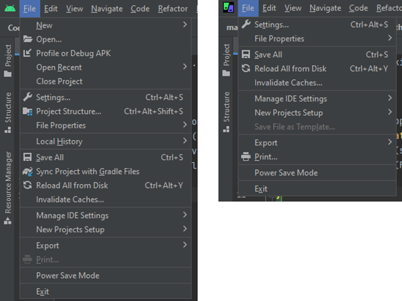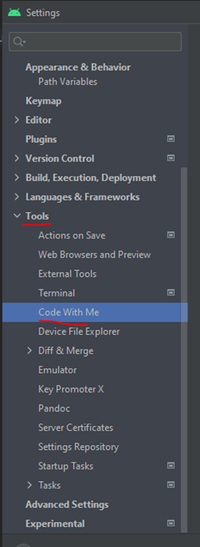 It is worth noting the limited capabilities of the participants connected to the project. For example, compare the File tab in the main project and CodeWithMe: