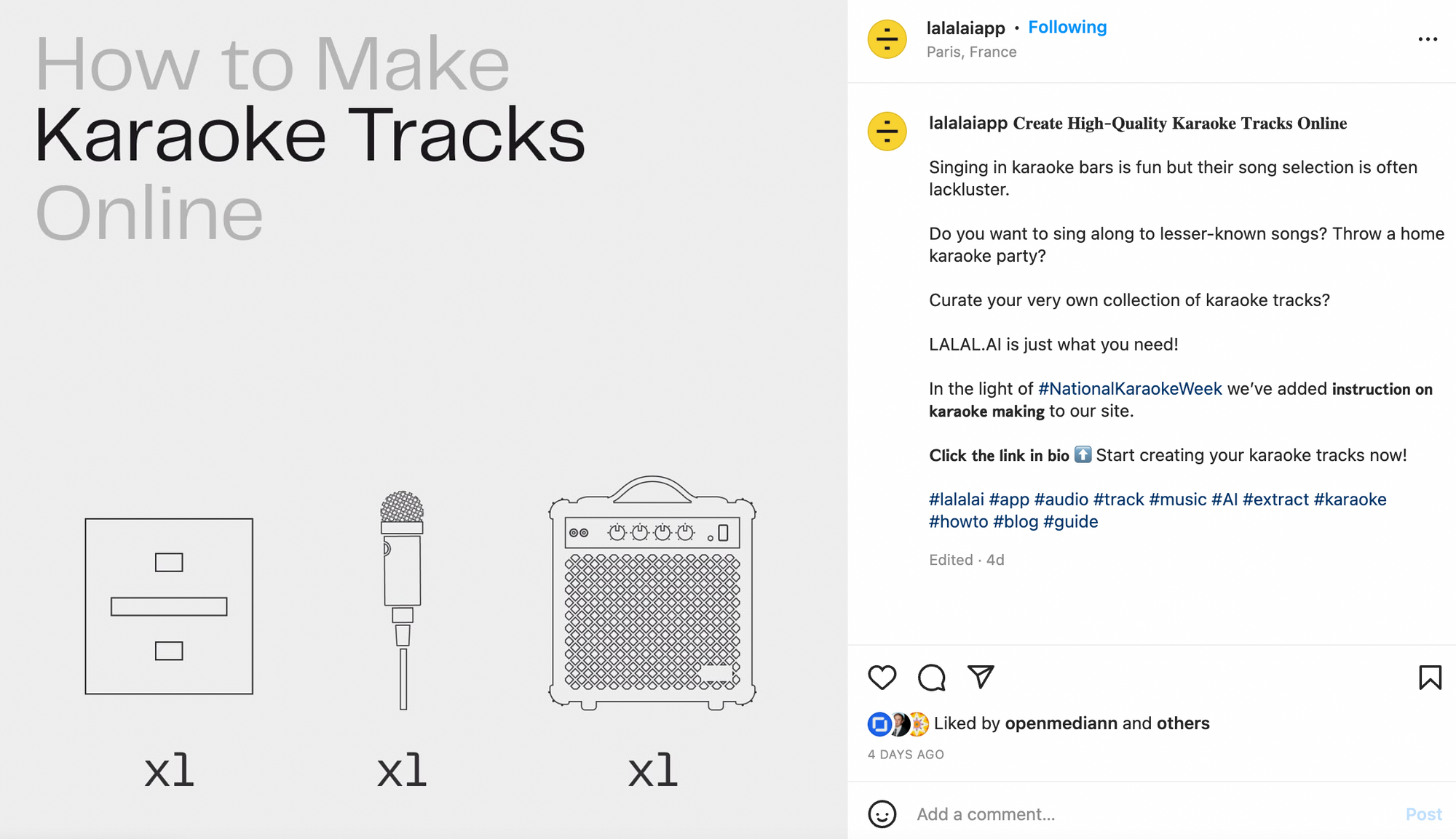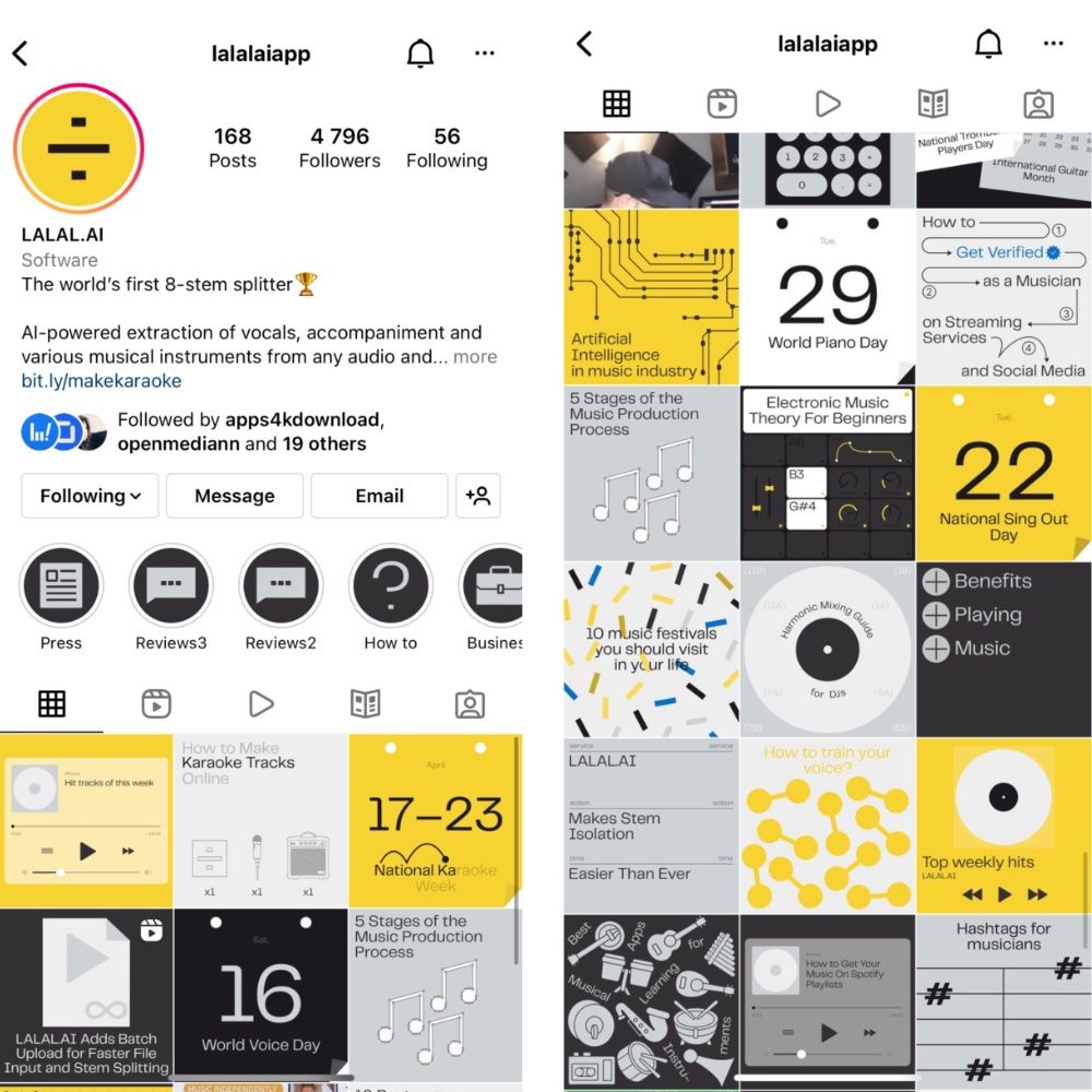 LALAL.AI is an example of when a product marketing becomes a designer gallery – captions are cleverly complemented by visuals. Dynamic concept helps pull in followers and makes them engage with content even if they're not your target audience.