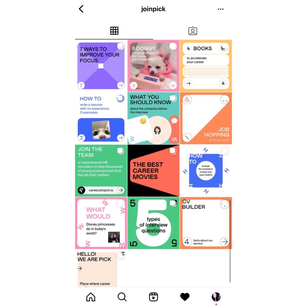 PICK's Instagram account is built on great colours, rounded images, emojis, and funny photos.