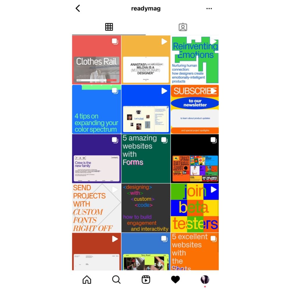 Readymag's profile uses a consistent template, bright colours and fancy fonts.