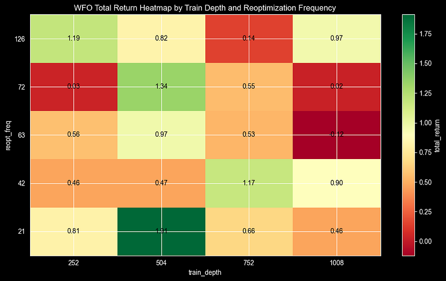 ax.set_title('WFO Total Return Heatmap by Train Depth and Reoptimization Frequency')