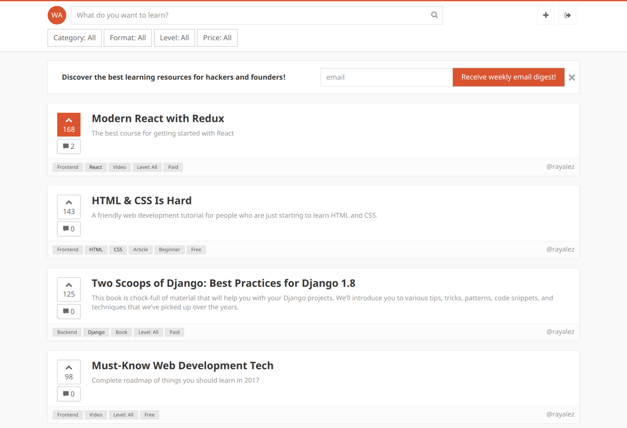 I have just launched a new project — http://webacademy.io. Our purpose is to help people to learn Web Development — I want to collect all the most awesome learning resources and make it easy to discover them. I think you guys will find it useful!