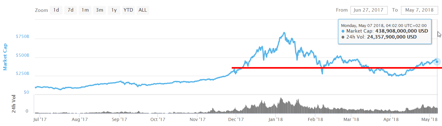 Market cap hit 470 billion dollars on 6th May and it looks like this can be our middle term resistance. We think we will see market floating in the area between 350–470 billion dollars for a few upcoming weeks.
