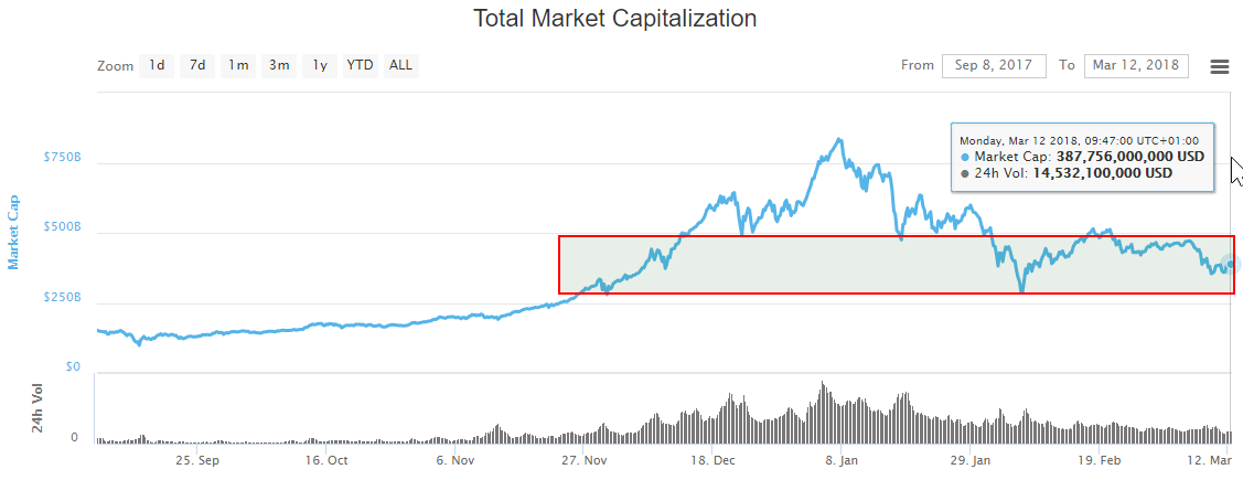 Market capitalization is still between 350–500 million dollars, which gives Bitcoin price ranging between 8500 and 9700 USD. The volume is slowly decreasing and that should be final week within that levels. Just hard to say what news will trigger the direction of movement.