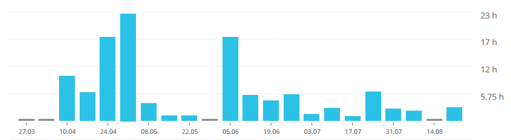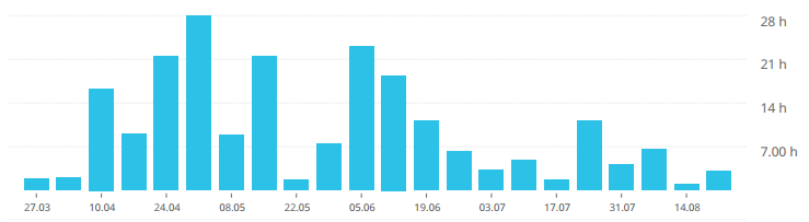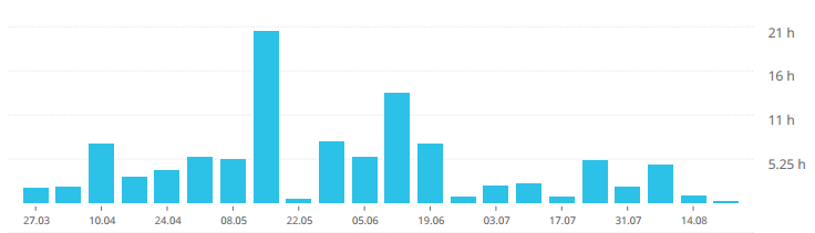 As of this writing, just under 210 hours, or about 5 working weeks and a day, spread out over just about five months.
