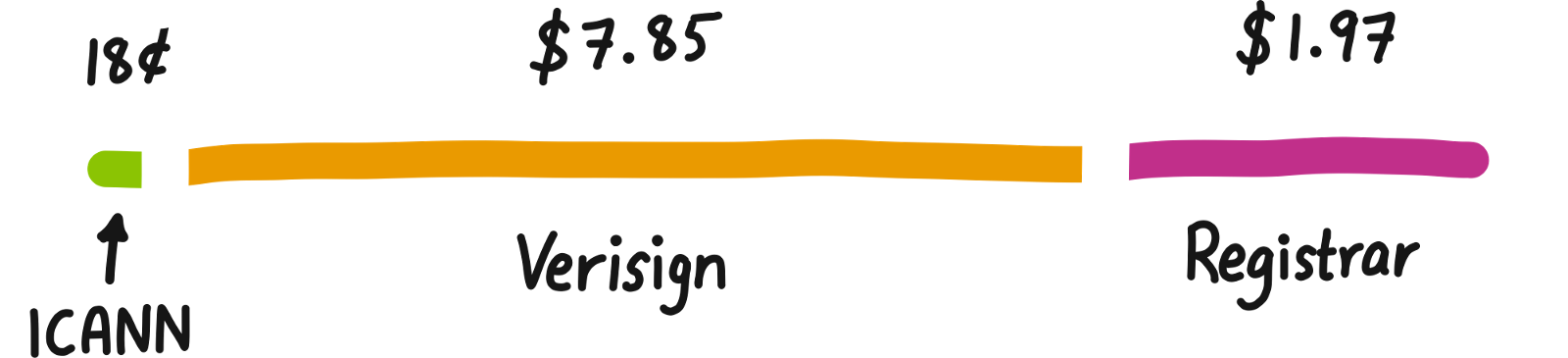 You pay money to the registrar (the shop), but they buy the domain from Verisign, the .com registry (the wholeseller), who have to pay ICANN (the regulator? the tax man?) a fee. Who gets what?