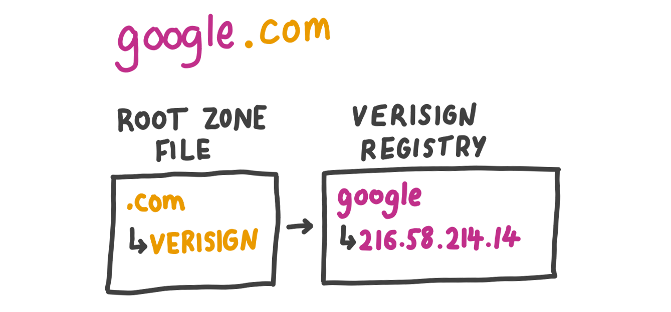 When you type google.com into your browser, the domain is split into parts by the “dot”, from right to left. The first part is “com”, so your computer checks the root zone file to see which registry manages the .com TLD. It then checks with this registry to see where the next part, “google”, points to. The registry returns the IP address 216.58.214.14, and your computer can then ask Google to send their homepage over.