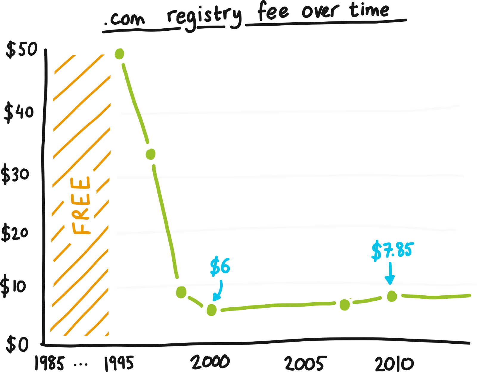 This is the yearly .com registry fee over the past 30 years: