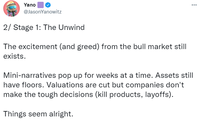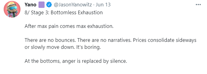 Right now, nobody knows for sure when the market will completely recover. However, it’s also worth noting that there are stages of a crypto bear market, and the best bet right now is to study them to see where the market is currently, and to better job of discernment when it starts to recover. Blockworks' Jason Yanowitz recently tweeted what he sees as the three stages of a crypto bear market, with the market currently in the second stage of a downturn.