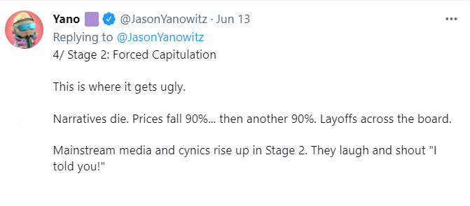 If you look at the second stage, precipitated by the $50 billion Luna collapse, you'll notice that there are a lot of liquidations as "diamond hands become forced sellers. They sell not because they want to, but because they have to," to quote Yanowitz.