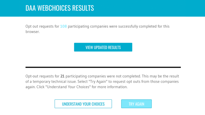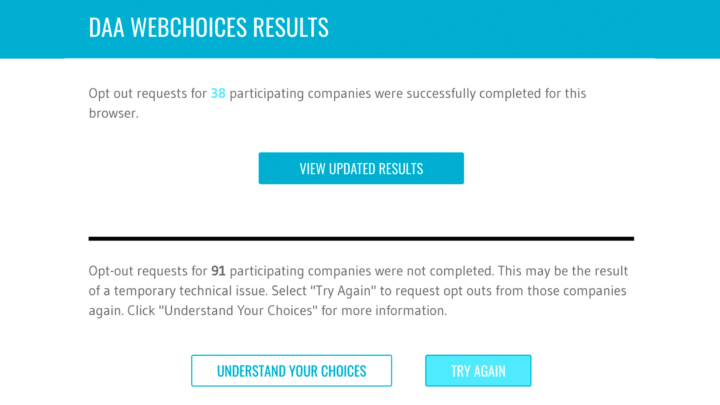 When I opened up a Firefox browser and went to the YourAdChoices.com opt-out page, I was greeted by a buzz of activity. The site started by automatically running some tests on my browser to check compatibility and then presented a list of participating ad tech companies. I hit the button to opt out of all of them, and we were off to the races. At the end, I got a report: 38 companies had processed my opt-out. The other 91? It said there may be a “temporary technical issue” with those.