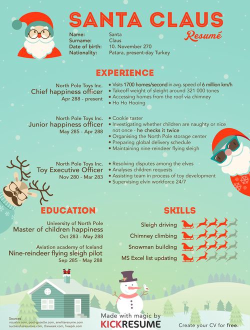 Santa knows that to find a new job he has to create a resume, write down personal information, work experience, skills, achievements and additional info. He asks one of his elves to make it look nice, fun and up-to-date. After thousands of Youtube tutorials and Linkedin pages elfe created this masterpiece: