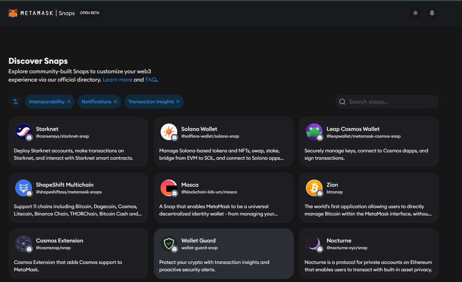 - Using the MetaMask Snaps SDK, any developer can build new features on top of the MetaMask wallet application, and users can install those features to customize the wallet experience. For example, transaction insight Snaps protect against malicious attempts to drain wallets by spoofing legitimate websites, and interoperability Snaps allow users to connect MetaMask with non-EVM (Ethereum Virtual Machine) blockchains).
