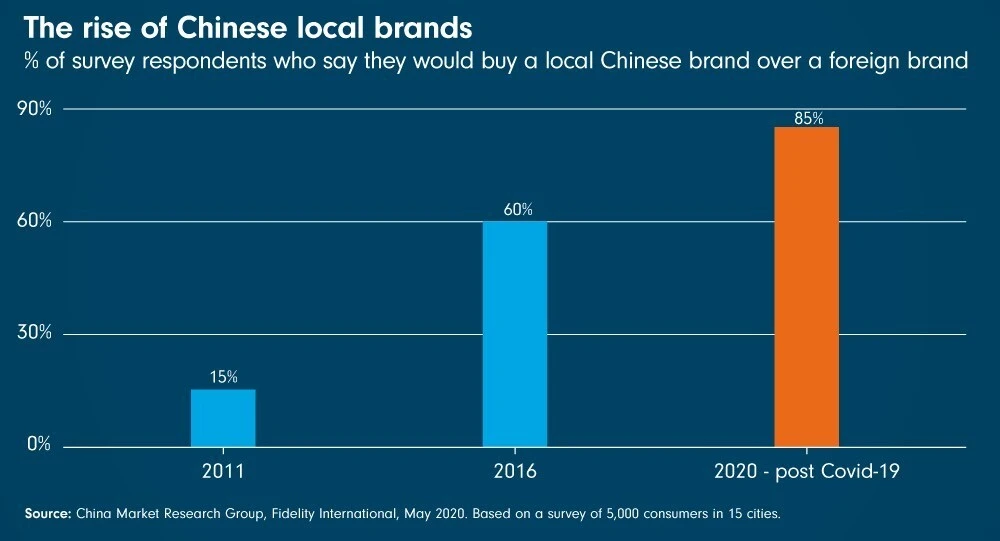 - The level of trust is increasing. A 2020 survey showed that 85% of Chinese prefer local brands over foreign ones (+25% since 2016; +70% since 2011).