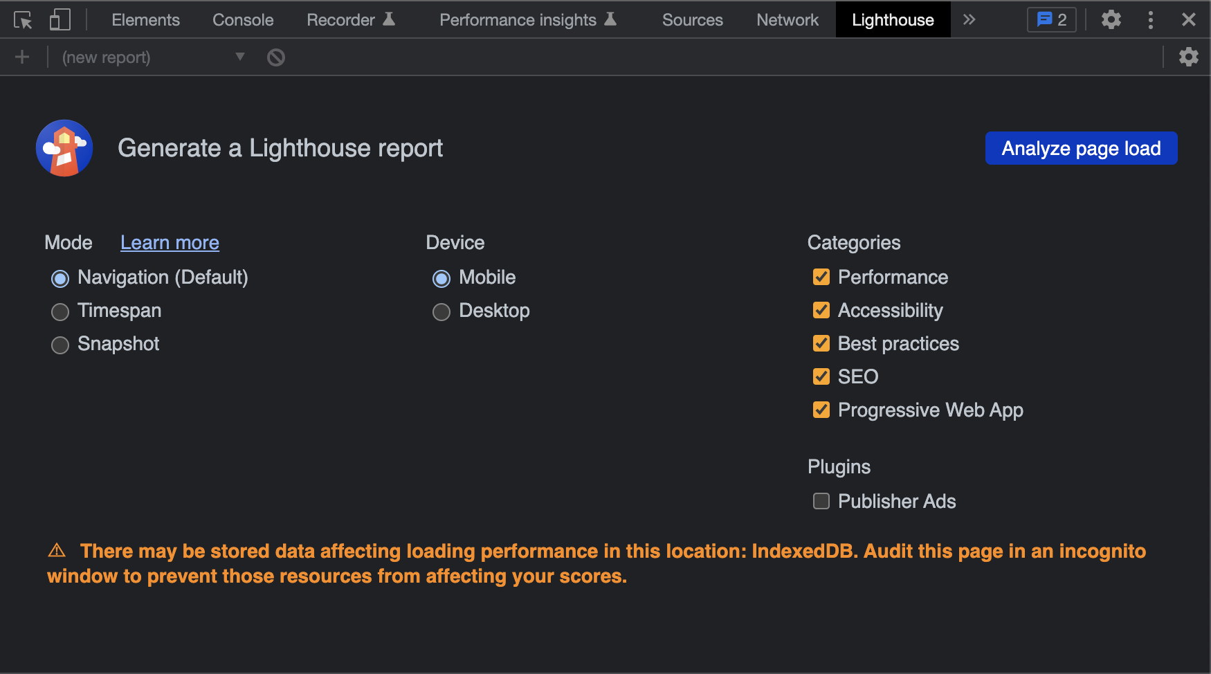 Just go inside dev tools F12 and choose the tab ‘Lighthouse’, and you can verify how your application works for Desktop or mobile devices. These tools help to find the problems and also provide suggestions for better performance.