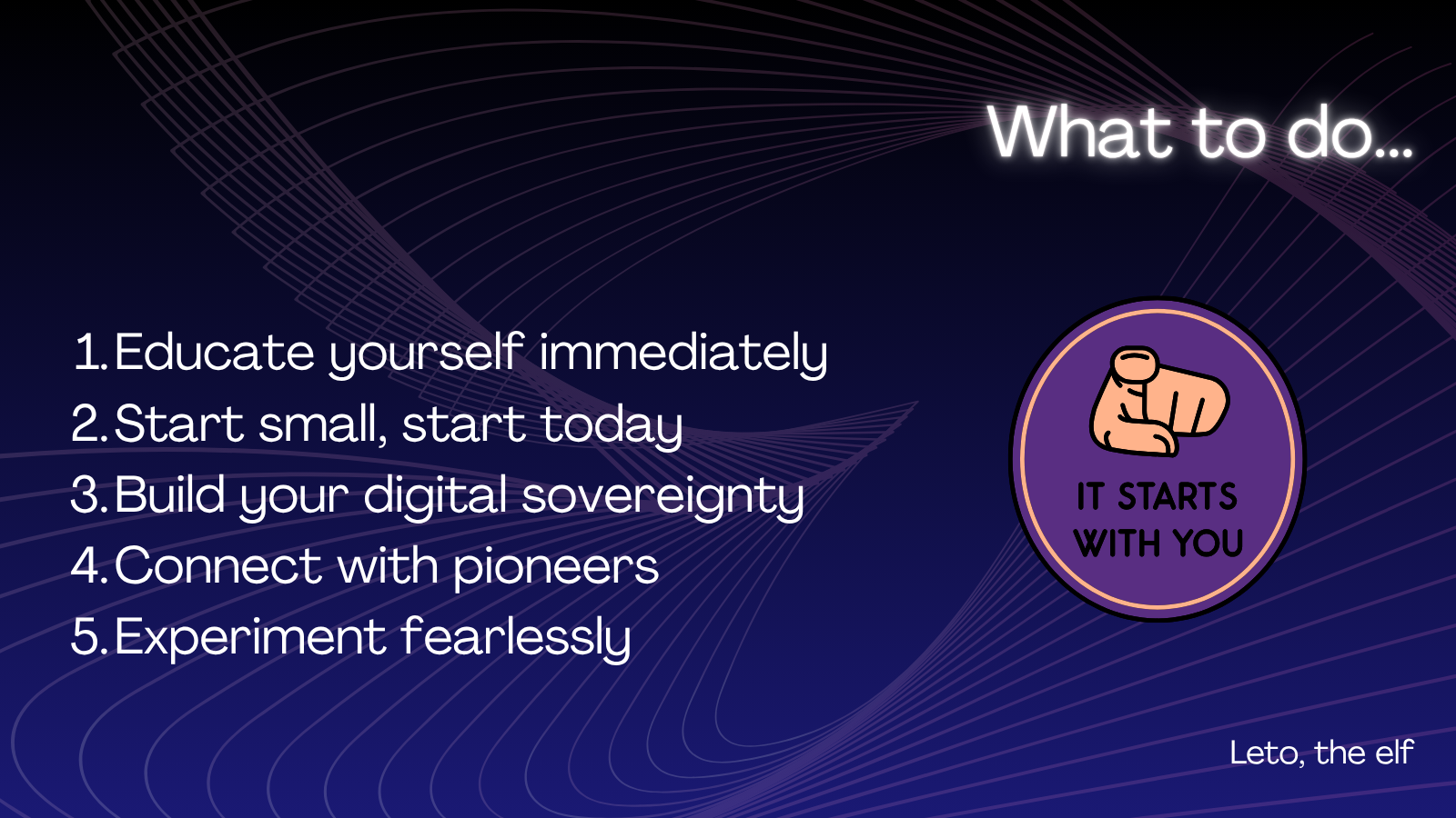 - Start small, start today - Create a digital wallet, explore a decentralized platform, or join a DAO. You don't need to understand everything; you need to start participating.