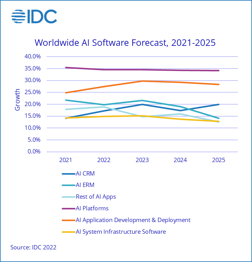 Among the AI software, hardware, and services solutions categories, the share of the last two will expand faster, with expected AI services compound annual growth rate (CAGR) of 22%, whereas the CAGR for AI hardware will be 20.5%. In the AI software category, AI platforms and application development are the leading segments showing a stable trend until 2025.