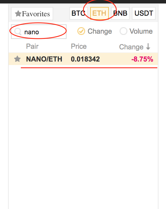 Now we need to find NANO coin with Ethereum trading pair on list of currencies. Check out following screenshot and instructions beside to do this.