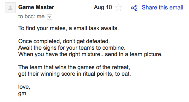 A few weeks before the retreat, once we get the dates sorted out, the GameMaster takes over.