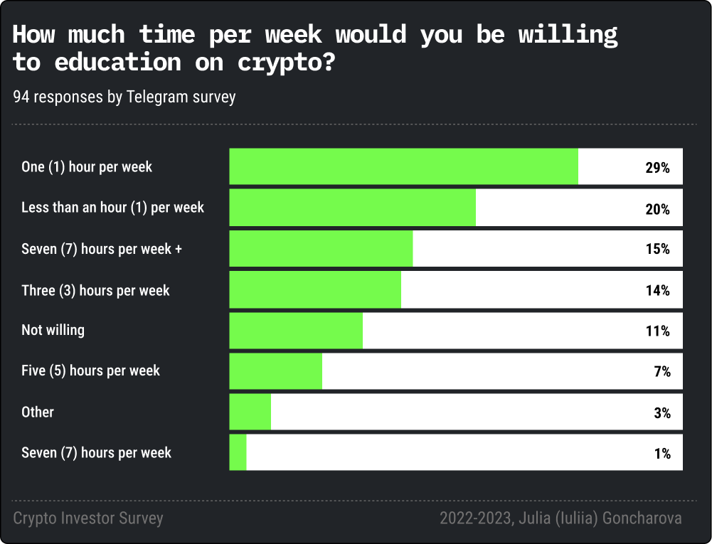 49% are not willing to devote more than 1 hour a week to learning crypto tools.