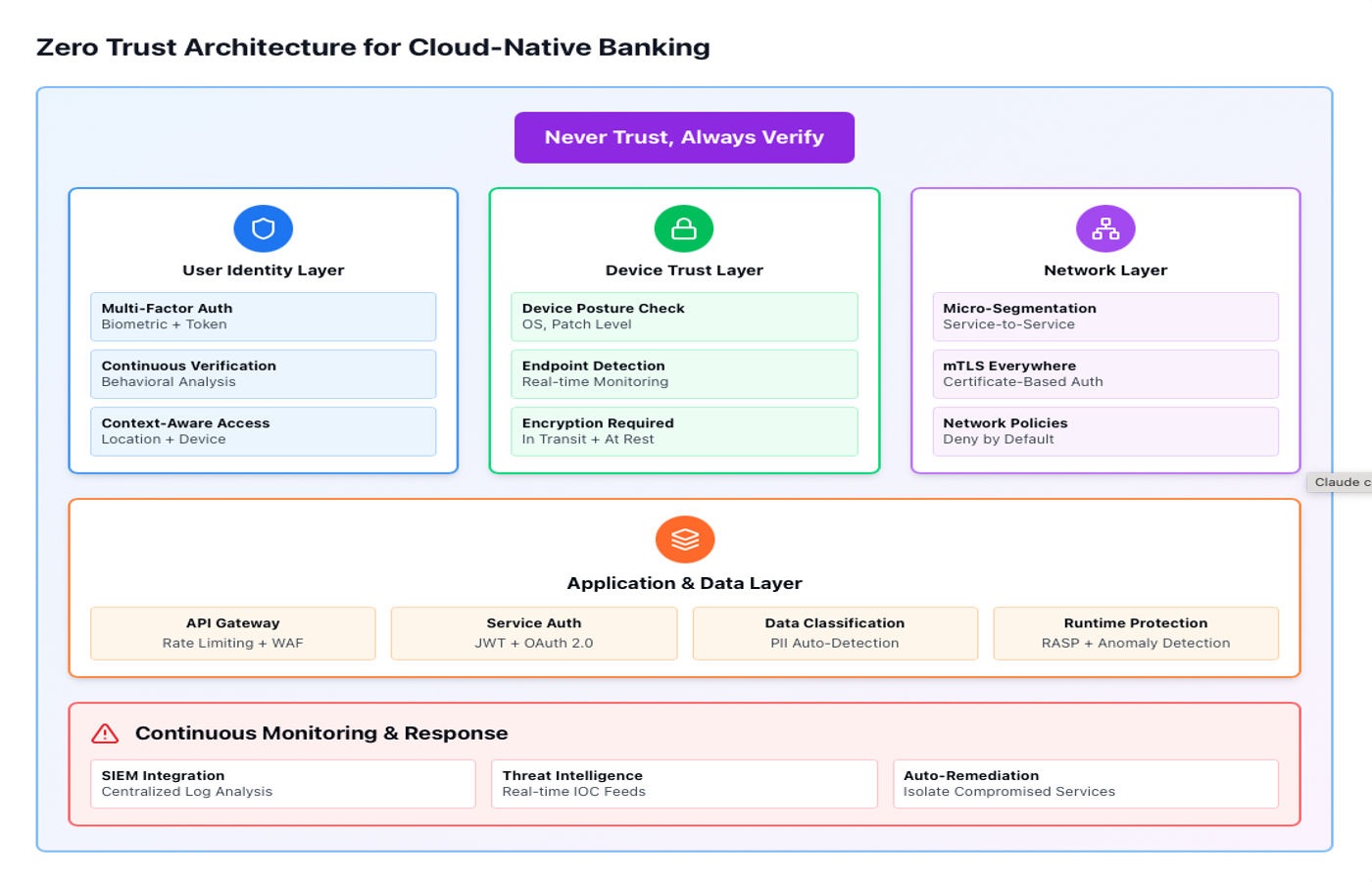 Cloud-native banking security requires abandoning the legacy assumption that systems inside a corporate network are inherently trustworthy. Zero Trust architecture flips this assumption entirely: never trust, always verify.